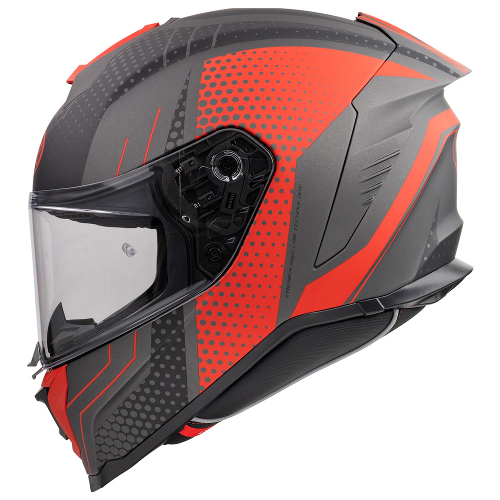 Anche la visiera è stata oggetto di un lungo studio, curato dal nostro reparto Ricerca e Sviluppo: è infatti più ampia dell’11% rispetto ai precedenti modelli Premier, offrendo così un campo visivo maggiore. Si tratta di una visiera Clear ad alta resistenza, processata con trattamento antigraffio e predisposta all’inserimento del sistema antiappannamento Pinlock®. Una lente Pinlock® si trova nella confezione, compresa nel prezzo. Il blocco visiera è posto al centro della mentoniera ed è facilmente azionabile: un semplice click rende il casco ancora più silenzioso e sicuro soprattutto a forti velocità.