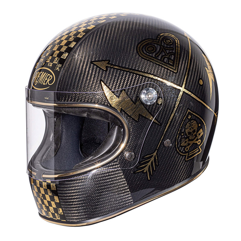 Trophy riprende lo stile e le forme dei caschi degli anni 70, ma è conforme ai moderni standard di sicurezza. Ha la calotta esterna stampata in una struttura multi assiale denominata DCA e composta da carbonio, dyneema e fibre aramidiche, amalgamate con resina epossidica. Un mix di fibre leggere e resistenti che contribuiscono a rendere Trophy robusto ma confortevole. La calotta interna è in eps ed è stampata a densità differenziata, per un il miglior assorbimento della forza generata da un impatto. Anche la visiera, pur essendo identica a quelle utilizzate dai campioni del passato, è omologata e dotata del trattamento antigraffio che garantisce sempre un ottima visibilità. Viene fissata alla calotta dal meccanismo che ne regola il movimento e da due bottoni godronati nella parte inferiore. Anche le imbottiture interne sono in perfetta sintonia con lo stile del casco e sono costituite da tessuti antiallergici con trattamento Sanitized con rifiniture in pelle sintetica. Le imbottiture delle guance, anch’esse rifinite in similpelle, sono removibili, mentre il comodo cinturino dispone di chiusura a doppio anello. Come tutti i caschi Premier anche Trophy è omologato secondo la vigente normativa ECE 22-05. Caratteristiche:Calotta: 1. Materiale: Fibra in carabonio e aramidica + resina epossidica. Interni: Guance removibili e lavabili con trattamento sanitized. Visiera: Antigraffio, chiara. Visiera int.: – . Fibbia: Doppio anello. Taglie: da M a XL Peso: 1.200 ± 50gr.